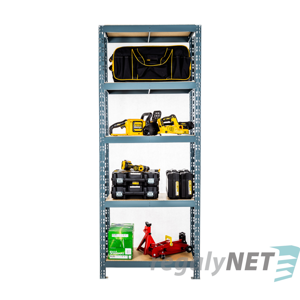 Nekonečně skladovací regaly 5-policový s lakovanou kovovou konstrukcí, policemi z DTD s nosností jedné police 200 kg. Lze napojovat na sobě. Hlavní modul + doplňkový modul .